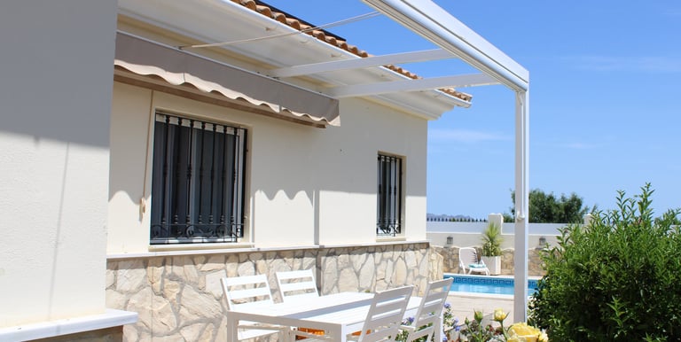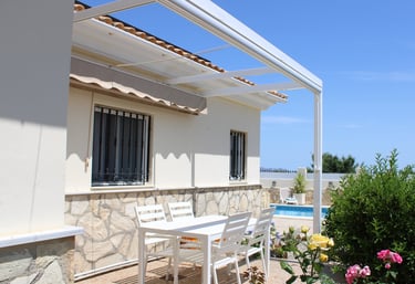 Enjoy a private swimming pool, air conditioning, and beautiful outdoor spaces for relaxation and dining.